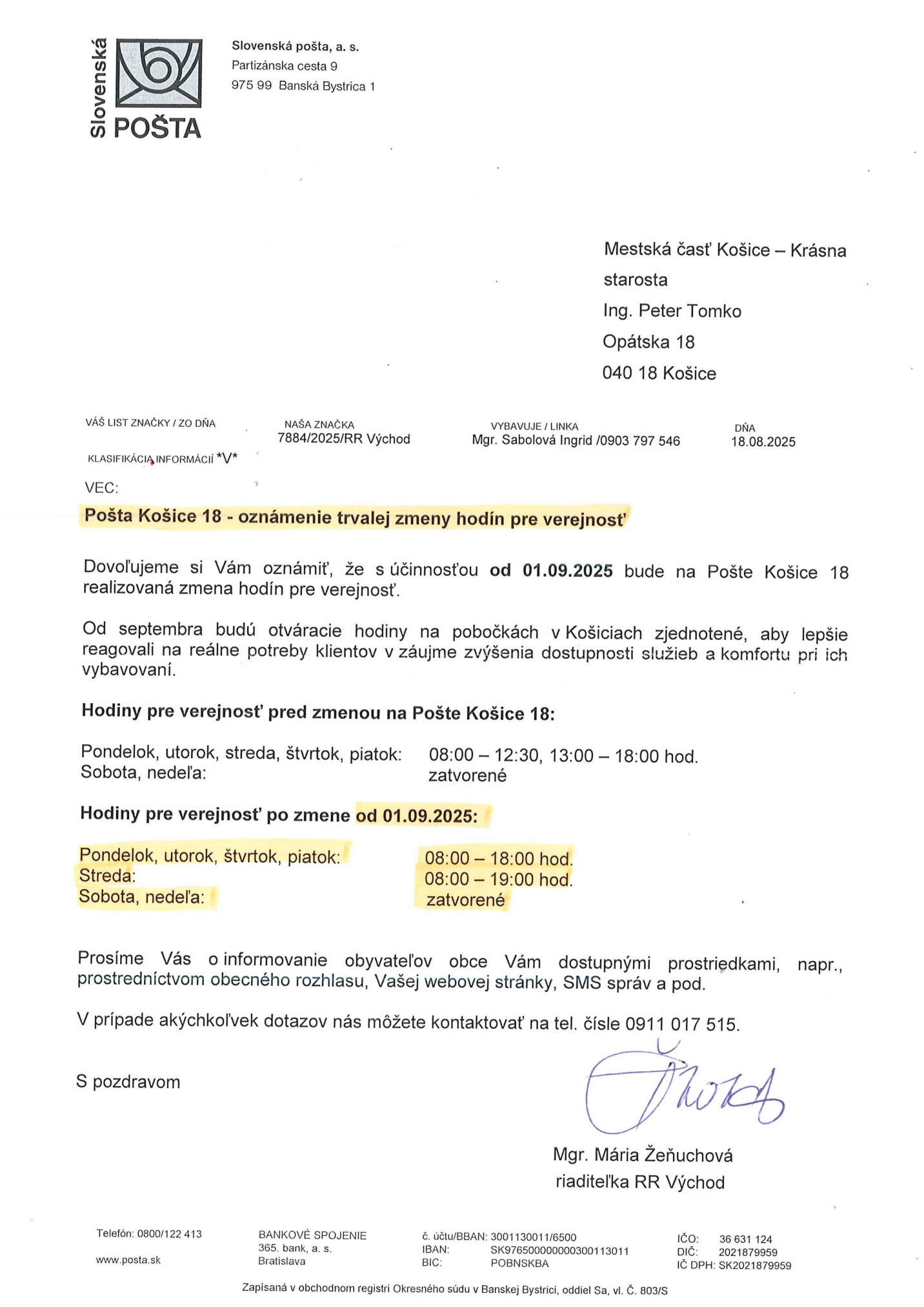 • Slovenská pošta, Opátska 18 - trvalá zmena hodín pre verejnosť od 01.09.2025