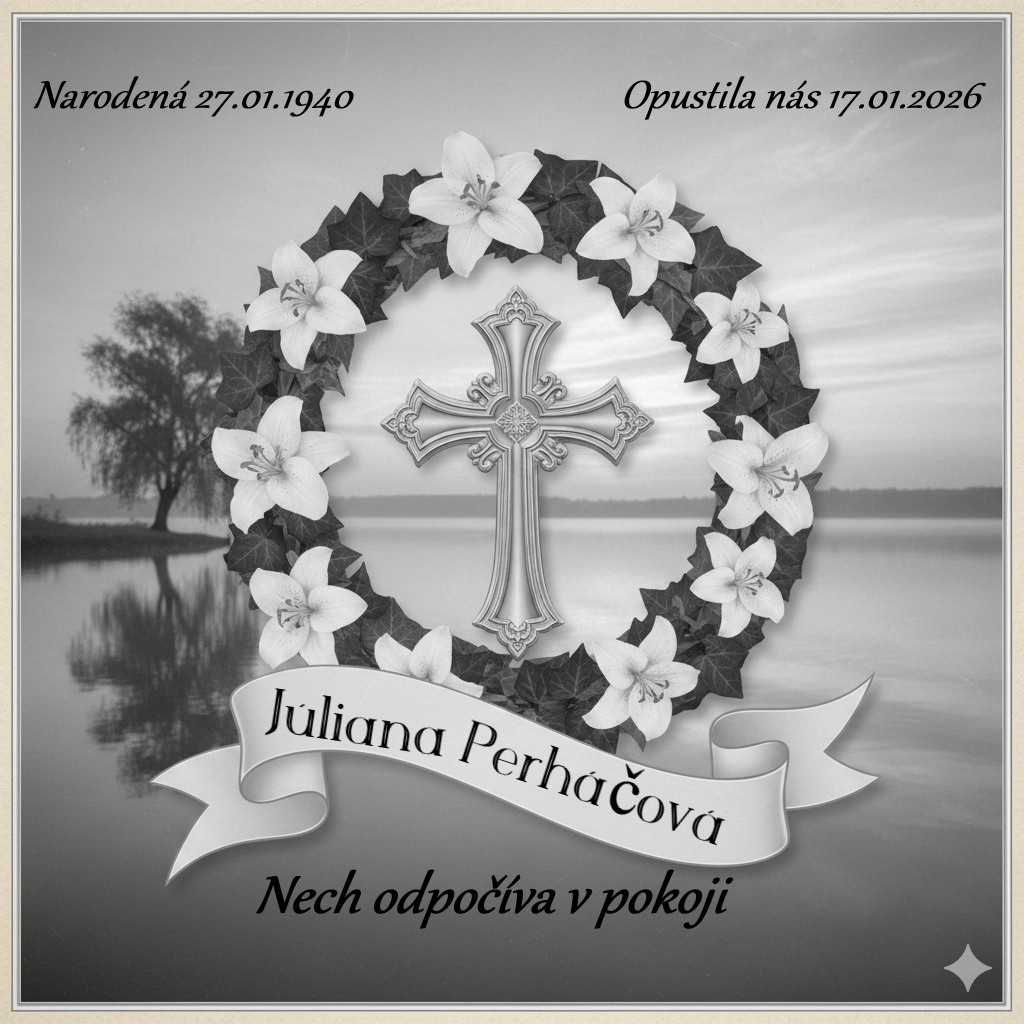 Smútiaca rodina so zármutkom oznamuje že vo veku 86 rokov zomrela mamka a milovaná učiteľka  Júliana Perháčová z Rehoľnej ulice. Posledná rozlúčka so zosnulou bude v piatok 23.01.2026 o 12:30 v Obradnej sieni na Verejnom cintoríne, Rastislavovej ulici v Košiciach. Česť jej pamiatke.